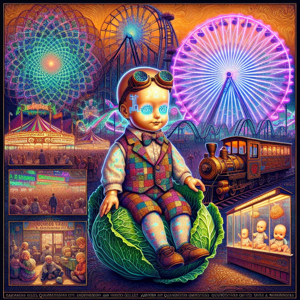 Synthesis: From Coney Island to the Quantum FutureThematic ConvergenceSpectacle & Science: Coney Island's blend of entertainment and medical marvels set the stage for a culture obsessed with the new, the strange, and the manufactured. Repopulation & Reinvention: The Cabbage Patch Kids and Orphan Trains mythologize the mass movement and reinvention of children, while Test Tube Babies literalize the dream of engineering the next generation.Brand New World: All these phenomenaβrooted in real history and surreal fantasyβspeak to a collective desire to transcend the limitations of birth, class, and fate, forging new identities in a world of perpetual transformation.Quantum ProphecyThe Future: As reproductive technology advances, the boundaries between natural and artificial, chosen and given, will continue to blur. The next waveβartificial wombs, gene editing, and AI parentingβwill make the Cabbage Patch, the Orphan Train, and the Test Tube Baby seem like mere prologues to a future where every origin story is up for reinvention. Conclusion: The Quantum Cabbage PatchFrom the boardwalks of Coney Island to the surreal cabbage fields and the steel rails of the orphan trains, the story of children's origins in the modern world is a tale of spectacle, science, and the endless quest for a brand new world. Whether plucked from a cabbage, born in a test tube, or shipped across the continent, the children of these stories are the avatars of our collective longing to transcend the past and quantum-leap into the future."We are all, in some sense, children of the Cabbage Patch, riding the Orphan Train to a world yet to be born.
